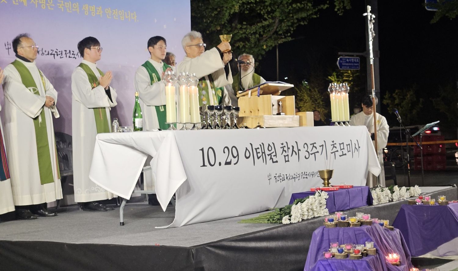 10월 27일 녹사평역 이태원광장에서 10.29 이태원참사 3주기 추모미사가 천주교정의구현전국사제단 주최로 봉헌되었습니다. 미사전 오후 6시 34분에 묵주기도를 바치며 참사당일 최초로 112 신고가 접수된 시간을 기억하였습니다.