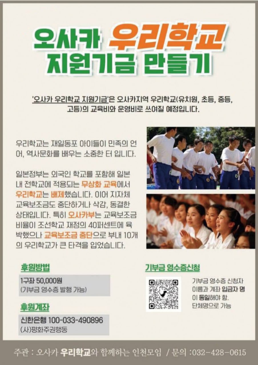 2023년 인천의 시민단체가 제안하여 조선학교 돕기 모금에 참여했던 단체들이 재일동포연대와 조선학교 지원을 위해 '오사카 우리학교와 함께하는 인천모임'을 결성하여 매년 모금을 진행하고 연대활동을 벌이고 있습니다. |