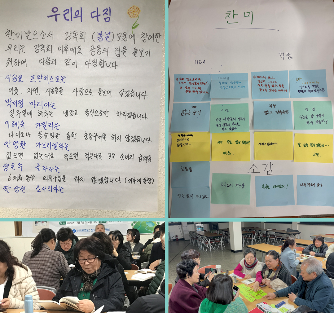 찾아가는 사회교리학교는 상반기 옥련동 성당, 하반기 부평2동 성당에서 진행되었습니다. 참가자들은 6주동안 프란치스코 교황 회칙 「찬미받으소서」를 강독하며 생태 실천을 하는 시간을 가졌습니다. 강독회 마무리 후 참여자들은 환경사도직 단체인 하늘땅물벗회를 구성하여 본당에서 환경실천을 이어가고 있습니다. (옥련동 36명/ 부평2동 22명 참여) |
