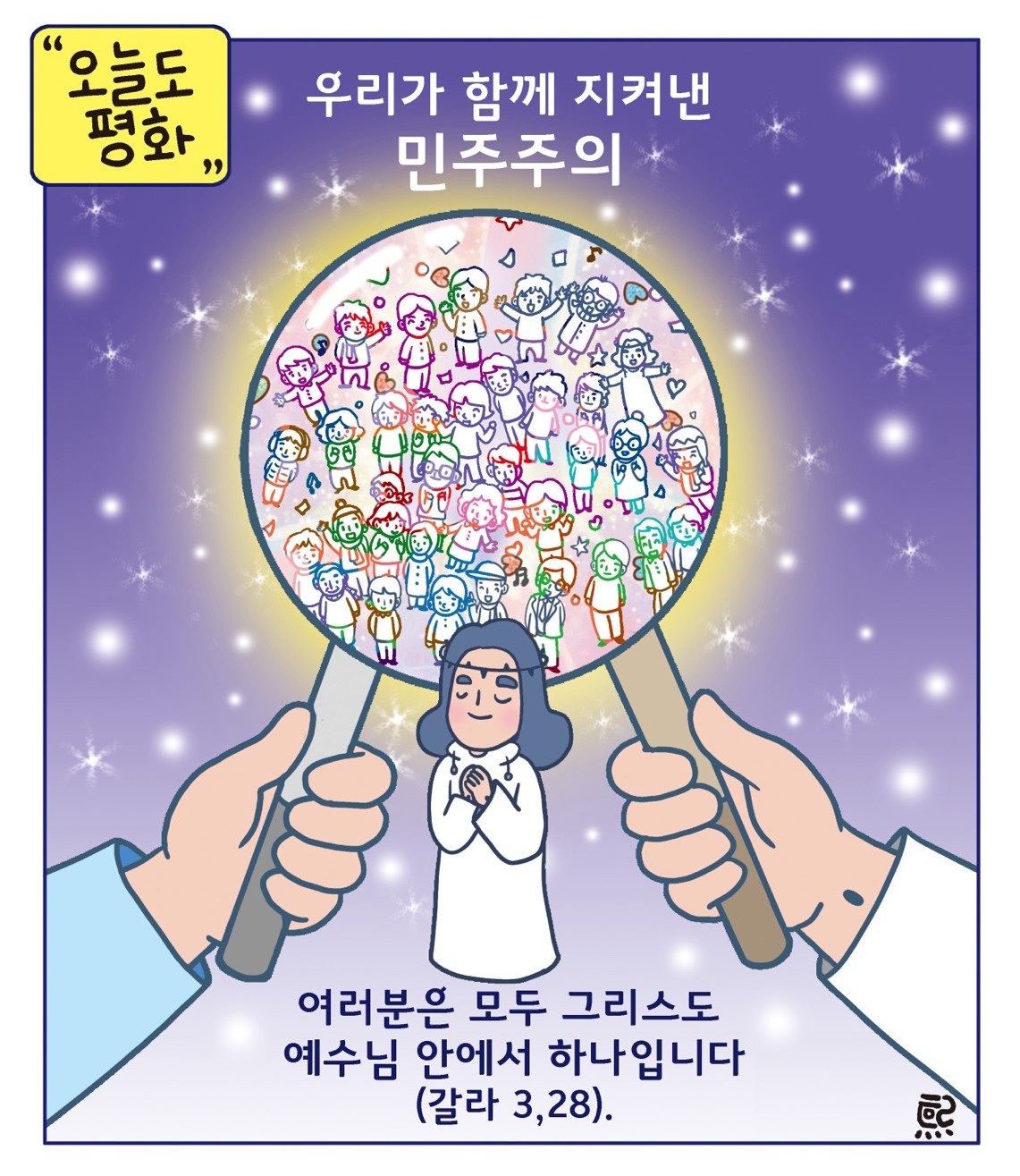 교회가 강조해 온 ‘참여하는 시민’, ‘양심에 따라 행동하는 신자’의 모습은 민주주의에서도 필수적입니다. 2024년 12월 3일의 계엄 사건은 우리에게 큰 상처였지만, 동시에 더 나은 공동체로 나아가는 길을 다시 묻는 기회였습니다. 우리는 지난 1년 동안 어떤 사회가 공동선에 부합하는지, 어떤 정치가 인간을 살리는지 질문해 왔습니다. 이제 필요한 것은 두려움이 아니라 성찰이며, 반복이 아니라 변화입니다. 진실을 밝히고, 개혁을 완수하며, 민생을 돌보고, 기본권을 넓히며, 국민주권을 실질화하는 길-그 길에서 우리는 비로소 민주공화국이라는 이름을 다시 확인할 수 있을 것입니다. 우리 공동체가 다시는 어둠에 흔들리지 않기를, 양심의 힘이 공동체를 지키는 빛으로 남기를 기도하는 마음으로 이 글을 마칩니다.