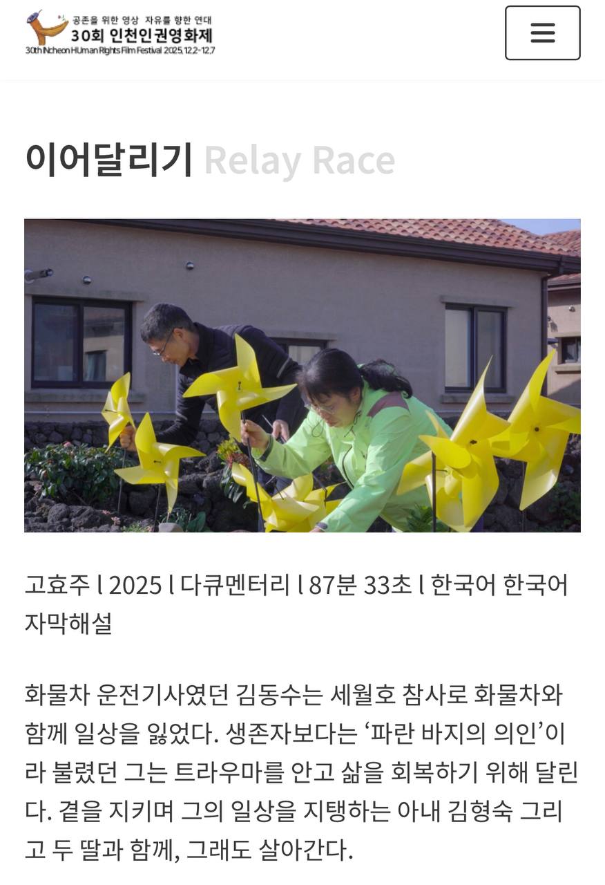 제30회 인천인권영화제에서 세월호 의인 김동수님을 담은 영화가 상영됩니다.